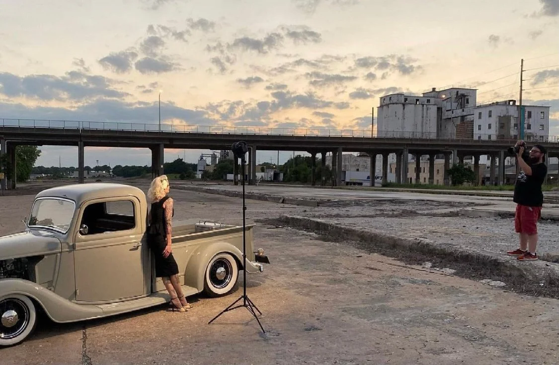 Photographing Birdy Mercury with a 1936 Ford, built by Ace Fabrication, for Car Kulture Deluxe magazine in Springfield, MO.